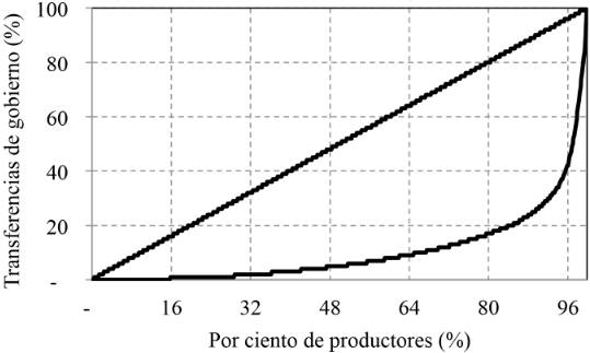 En 2009, los productores agropecuarios de Chihuahua recibieron, en promedio, por concepto de transferencias 42 073 pesos anuales del Programa de Apoyos Directos al Campo (Procampo), Producción Pecuaria Sustentable y Ordenamiento Ganadero y Apícola (Progan), Activos Productivos, entre otros. Los productores del estrato AA recibieron en promedio 44 663 pesos (±159 087), AM 22 549 (±49 768) y AB 44 271 (±129 551). Al ser programas que atienden a productores agropecuarios en función de sus activos, la distribución de las transferencias favorece a productos con mayor cantidad de activos. El CG para todos los productores fue 0.75 y, por estrato, los de AA 0.79, AM 0.82 y AB 0.79. Esto indica que la mayor desigualdad se concentra en los productores de activos medios (Figura 4).