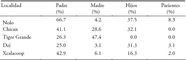 Es en estas relaciones de parentesco entre los actores donde los aspectos sociales como edad, género y escolaridad condicionan el acceso a los recursos naturales, ya que como se observa en el Cuadro 1, los jefes de familia laboran ya sea como asalariados en la localidad o fuera de ella o desarrollan actividades agrícolas. Generalmente las madres, y en menor proporción los hijos y los parientes, son quienes realizan el cuidado del huerto familiar, cuya mayor superficie promedio (1,210.4 m2) se encontró en la localidad de Dzi, mientras que la menor superficie (427.9 m2) se identificó en Xcalacoop; estas áreas de cultivo dependen en gran parte de la actividad económica dominante, tamaño de la familia y cercanía a centros urbanos como lo expuesto por Rebai (2013) en la Sierra Ecuatoriana.