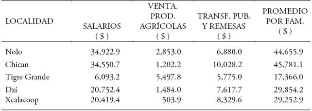 La diversidad y riqueza de especies que integran los huertos familiares y la milpa presentan un evidente doble papel en el destino de sus productos, ya que por una parte las especies vegetales resuelven necesidades alimenticias, de construcción y de salud. Por otra parte, representan una fuente de ingresos al canalizar parte de los productos y subproductos a los mercados locales o foráneos, lo cual se confirma a partir de los resultados obtenidos por González et al. (2002) en los montes secundarios de Yucatán. Es por lo anterior que en localidades como Tigre Grande la aportación al ingreso por venta de productos del huerto y la milpa alcanzan un valor significativo, cercano al obtenido por transferencias o salarios como se observa en el Cuadro 5.