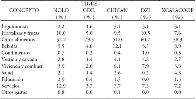 Como se puede constatar en el cuadro anterior, la mayor parte de las familias obtienen un ingreso promedio mensual que puede considerarse bajo, de acuerdo con las líneas de pobreza (Boltvinik y Hernández, 1999). Por ejemplo, en la localidad de Chican, municipio de Tixmehuac, donde el mayor número de los integrantes de la familia labora fuera y se beneficia de los programas sociales de transferencia, tal ingreso no supera los 274 dólares por mes, mientras que en otras localidades este ingreso no supera los 104 dólares. Lo anterior evidencia la importancia de obtener parte de los productos alimenticios de sus sistemas de producción, debido a que el gasto familiar se destina es más de 60% al rubro de alimentos (Cuadro 6)