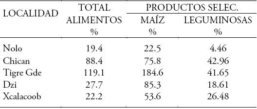 El índice de autosuficiencia alimentaria para las localidades de Dzi, municipio de Tzucacab e Xcalacoop, municipio de Tinum, evidencia una significativa dependencia hacia los mercados para garantizar el acceso a los productos alimenticios como lo hacen evidente Osegura (2001) en centros urbanos e Dyer (2005) en estudios realizados en la sierra de Puebla. Esto, a pesar de que en Dzi el balance de producción-consumo del maíz ocupa el segundo lugar entre las cinco localidades, cuya producción es favorecida por su ubicación en la región sur del estado, donde la floresta, calidad y disponibilidad del suelo y la precipitación pluvial, resultan mayores con lo observado en Nolo e Xcalacoop. Cabe mencionar que en esta última localidad el sistema de producción tradicional se caracteriza por una forma de realización de la siembra, en la que a cada golpe de espeque (orificio realizado en el suelo con una vara de madera y punta de metal) se depositan tanto las semillas de maíz, leguminosas y calabazas. Con esta práctica, la productividad de cada cultivo resulta inferior a lo estimado en las localidades de Chican y Tigre Grande, con excepción de Nolo; como evidencian Toledo et al. (2008) en estudios realizados en el oriente del estado de Yucatán.
