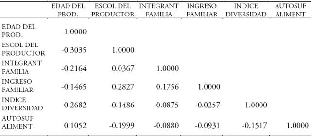 Por otra parte, resulta necesario comentar la tendencia que proporciona el coeficiente de correlación del valor de algunas variables socioeconómicas e índice de diversidad con el valor del índice de autosuficiencia alimentaria (Cuadro 8). Por ejemplo, en esta se confirma la relevancia que representa la edad del productor en la conservación del inventario de las especies vegetales que se aprovechan en los sistemas de producción a pequeña escala, como la milpa. Aquí se obtienen, principalmente, alimentos básicos. La variable mencionada tiene una influencia fundamental sobre la preservación del conocimiento tradicional referente al uso y destino de las especies, ya que debido a la falta de oportunidades de empleo por la edad, el productor tiende a asegurar su autosuficiencia alimentaria a partir de su producción y de la mayor diversidad de especies en cultivo. Lo señalado es un aspecto determinante en la variedad de alimentos que requiere para su subsistencia, como destaca Alarcón (2006) respecto a la relevancia de los grupos indígenas poseedores de principios ecológicos que combinan un sistema social y reglas que permiten el equilibrio entre la naturaleza y las demandas sociales, aunado a las creencias representadas y expresadas por mitos y ritos colectivos.