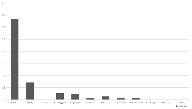 La distribución de la agricultura orgánica en Chile es asimétrica; se concentra en la Región del Biobío el 66,9% de la superficie nacional seguida, en segundo lugar, y con una menor participación relativa, el Maule (14,2%) y O’Higgins (5,4%) (Gráfico 2). Lo anterior responde a la especialización productiva de este tipo de producción que se localiza especialmente en la cuenca frutícola del país, en la zona centro-sur del país, caracterizado por su agrosistema mediterráneo.