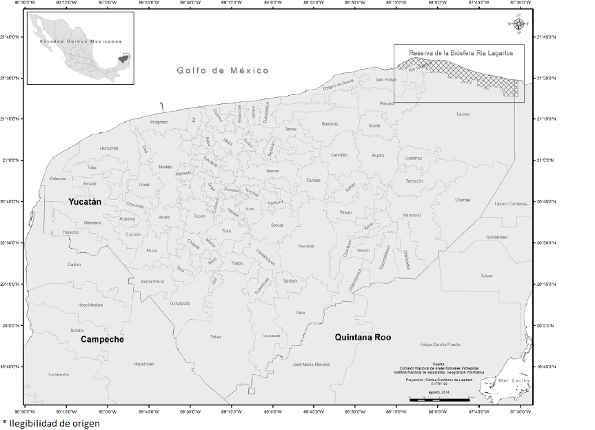 El estudio se llevó a cabo en la reserva de la biósfera Río Lagartos (Figura 1) que abarca las comunidades de Río Lagartos, San Felipe, Coloradas y El Cuyo (Conanp, 2007). Esta área fue decretada, en 1999, para proteger el principal sitio en México de anidación del flamenco americano, ya que alberga el 80% de la población de toda la Península de Yucatán, estimada en los últimos años en 30,000 individuos (Ramsar, 2001; Migoya y Tabasco, 2010). El flamenco tiene un comportamiento gregario por lo cual conforma grandes grupos de individuos distribuidos a lo largo de rías y esteros. Por su visibilidad y accesibilidad, su presencia constituye un recurso turístico de alto atractivo para los visitantes y es en Río Lagartos, comunidad con 3,438 habitantes (inegi, 2010), en la que la actividad turística se encuentra más desarrollada.