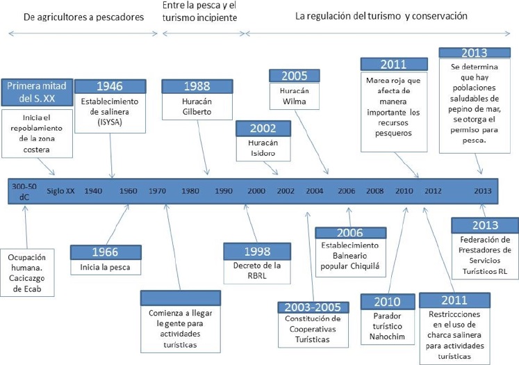 Para entender la transformación de los procesos sociales en torno al turismo y la conservación se partió del momento en el que la comunidad de Río Lagartos se estableció en el área. El análisis reconoció tres etapas distintivas en términos de las prácticas organizativas e incidencia de los actores (Figura 2). La primera, denominada De agricultores a pescadores, abarca el repoblamiento más reciente de la zona ocurrida a principios del siglo XX. Una segunda etapa llamada Entre la pesca y el turismo incipiente, abarca el surgimiento del turismo en la región entre los años 1970 y 1999. La última y más reciente, denominada aquí De regulación del turismo y conservación, está marcada por el establecimiento de la RBRL (1999). Las prácticas organizativas y la influencia en las instituciones se explican a continuación.