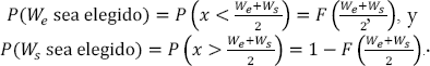 Existen dos partes, una empresa y el sindicato que están en disputa por el grado de aumento del salario actual. Si las partes no llegan a un acuerdo, la decisión final es tomada por un juez, y esta decisión será el salario final que regirá para ambas jarres. Sean Ws y We los salarios que fijan el sindicato y la empresa respectivamente. La forma que determina el juez el salario final es la siguiente: al principio el sindicato y la empresa proponen los salarios Ws y We respectivamente, y se los entregan al juez en un sobre cercado, además We < Wt. Antes de abrir- los sobres, el juez propone un salario X, y una vez abiertos decide fijar el salario más cercano al valor X. Con base en esto, sea Wf la decisión del juez, que de acuerdo a lo anterior cumple lo siguiente: