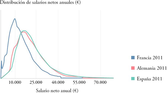 Con la distribución de salarios de una economía se puede extraer información relevante como, la media, la mediana o algún sesgo que pudiera existir. Esto es importante ya que se puede relacionar con otras variables económicas y determinar con ello la salud económica de un país. Estas distribuciones para la mayoría de los países, son sesgadas, como lo muestra la Figura 1 para los casos de Francia, Alemania y España. Con esto se muestra, que no necesariamente distribuciones sesgadas caracterizan a economías pobres.