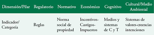 Así nuestra matriz de análisis tiene cinco dimensiones. Las dos primeras atienden mecanismos e intencionalidades de gobierno de las instituciones; la tercera ubica las restricciones e incentivos de naturaleza económica que condicionan respuestas entre organizaciones e instituciones; en tanto las dos últimas exploran los terrenos de los sistemas de ciencia y tecnología, las ideas, las creencias, las tradiciones y los sistemas de valores, así como los ámbitos culturales y ambientales de operación. Con ella indagamos por los programas de gobierno, líneas de estrategias y acciones específicas, instrumentados para regular, atraer y fomentar el crecimiento, competitividad e innovación de la industria.
