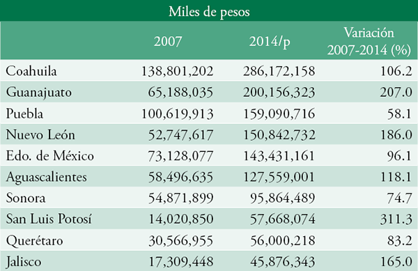 Entre 2001 y 2014 la producción de autos se incrementó en 78% de 1.8 a 3.2 millones de autos para una tasa de crecimiento de casi 6% anual, pero entre 2010 y 2014 la producción ha aumentado en 41.5%, para una tasa anualizada superior a 8%. Todos los grandes corporativos están colocando importantes inversiones en el país; en el primer trimestre de 2015 representó 54% de la IED total. De ellas, tan sólo GM anunció inversiones por 6 mil millones para el periodo 2014-17, en tanto el resto vino de planes constructores de fábricas de Daimler-Nissan, BMW y Kia.