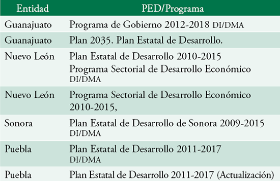 Para documentar las diferencias regionales en materia institucional analizamos los programas e instrumentos gubernamentales de intervención en el sector automotriz en las cuatro regiones automotrices: Bajío, Noreste, Noroeste y Centro. Como fue anotado, se seleccionó una entidad para cada región; el análisis más puntual quedó en Guanajuato, Nuevo León, Sonora y Puebla. La estrategia se centró en el análisis de los ejes, estrategias y líneas de acción enfocadas al desarrollo económico y/o al fomento a la industria, puntualizado en los Planes Estatales de Desarrollo (PED), así como los Programas Sectoriales de Desarrollo disponibles. Sobre esto último, sólo en Nuevo León se ubicó -y luego pudimos analizar-un programa al respecto, el Programa Sectorial de Desarrollo Económico de Nuevo León. Se revisaron documentos en materia de innovación (DI), medio ambiente y/o desarrollo sustentable (DMA) de los gobiernos con la finalidad de evaluar las visiones y acciones de estas entidades respecto a estas dimensiones cruciales para un proyecto de desarrollo regional vinculado a la industria, y en especial a la actividad automotriz. De igual forma cuando existía algún documento de planificación económica derivado del PED, se procedió a su revisión. Estos fueron los casos de Guanajuato y Puebla; en el primero se ubicó y trabajó un plan estatal con visión a largo plazo (Plan 2035), mientras que en el caso de Puebla se ubicó y trabajó la actualización del PED. En el Cuadro 6 se incluye la relación de documentos revisados.