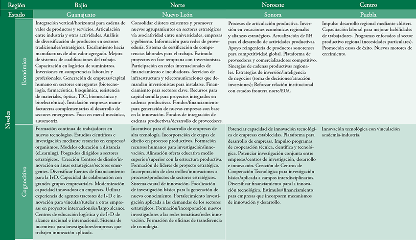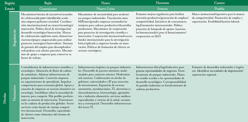 Existe una gama de nociones normativas complementarias a lo previo como buscar la modernización de infraestructura, el estímulo a procesos de articulación productiva y aprovechamiento de las vocaciones económicas regionales. En la dimensión regulatoria se proponen acciones en materia de mejora para el estímulo a la inversión productiva, la generación de empleos y la competitividad. En el orden cognoscitivo se incluyen intenciones de potenciar capacidades de innovación tecnológica a partir de programas de cooperación técnica, científica y tecnológica entre empresas y centros de investigación; fomento a la transferencia tecnológica; y creación e impulso a Centros de Cooperación Tecnológica Interdisciplinarios.9