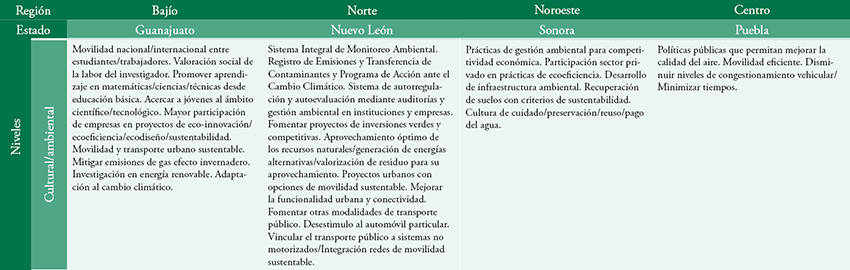 Las líneas para la dimensión cognoscitiva son explicitas en conectar al tejido productivo e industrial con la I+D y la innovación. En este nivel se resumen acciones relacionadas con el desarrollo de empresas de alta tecnología, la incorporación de etapas de diseño en los procesos productivos, la formación de recursos humanos alineando la oferta educativa para la investigación e innovación en sectores estratégicos, y el fortalecimiento del conocimiento científico y tecnológico. Las nociones de orden cultural/ambiental consideran acciones en materia de monitoreo ambiental y registro de emisiones, fomento a proyectos de inversiones verdes, generación de energías alternativas, así como nuevas perspectivas en materia de movilidad, funcionalidad urbana y conectividad. Un elemento sobresaliente en estas dimensiones es la inclusión en el PED del fomento de otras modalidades de transporte público, el desestimulo al uso del automóvil particular y la vinculación del transporte público a sistemas no motorizados, esto es integración a redes de movilidad sustentable.