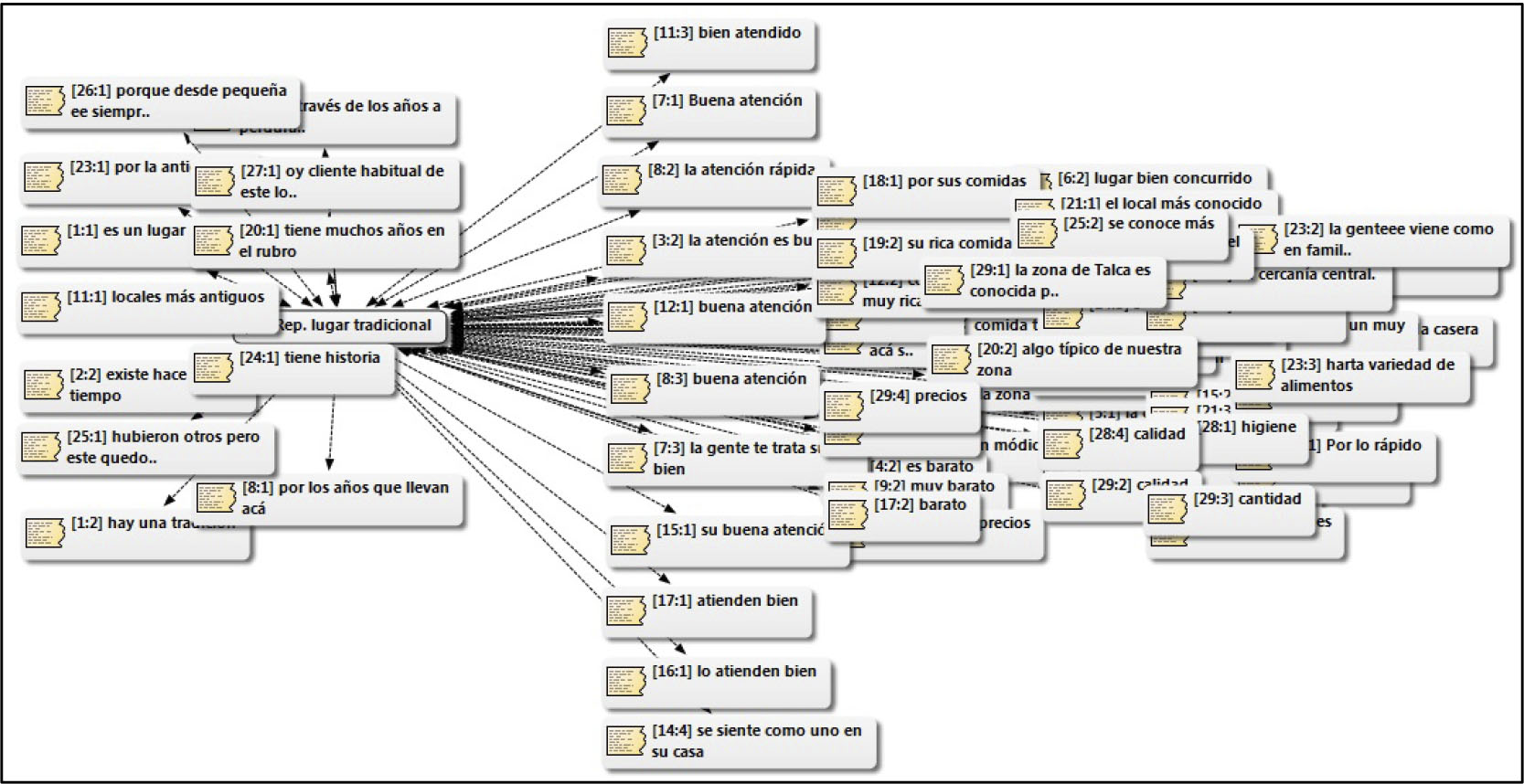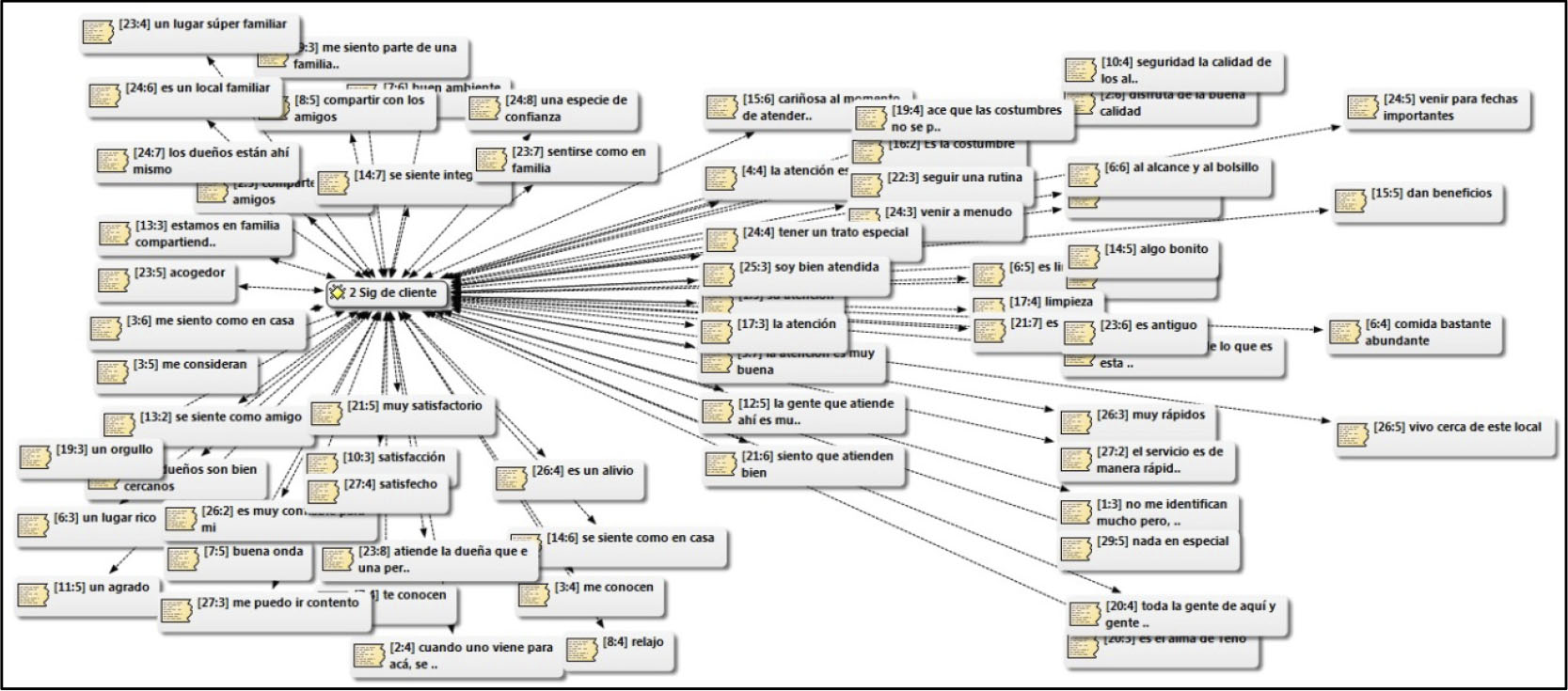 El carácter de la historia termina siendo un parámetro de lo tradicional, sin embargo y como veremos más adelante, esta composición de tradicional se torna difusa en su noción, cuando se comenzar a asimilar lo tradicional con aspectos y practicas propias de la modernidad (Anigstein, 2013), críticas al mundo moderno que se deslizan desde los elementos poco concretos y abstractos de lo social, lo que Bauman (2002) denomina modernidad líquida. En relación al mismo objetivo específico inicial, se plantea la pregunta Nº 2 ¿Qué significa para usted ser cliente/Dueño o encargado del lugar? Los sujetos del estudio se representan la condición de clientes, en razón a la emergencia de sentimientos de familiaridad, confianza, satisfacción, agrado, cercanía, asociado a la buena atención. Desde la antropología, los sistemas alimenticios han sido abordados desde composiciones religiosas y nociones de hermandad o comunidad (comensalismo), para llegar a los sentimientos sociales que genera el alimento como elemento nutricional y dietético en términos sociales y productivo-económicos (Montecino, 2004). Según lo anterior, un cliente se refiere en los siguientes términos a su calidad de comensal: Me siento parte de una familia al venir a comer acá (C. 17).