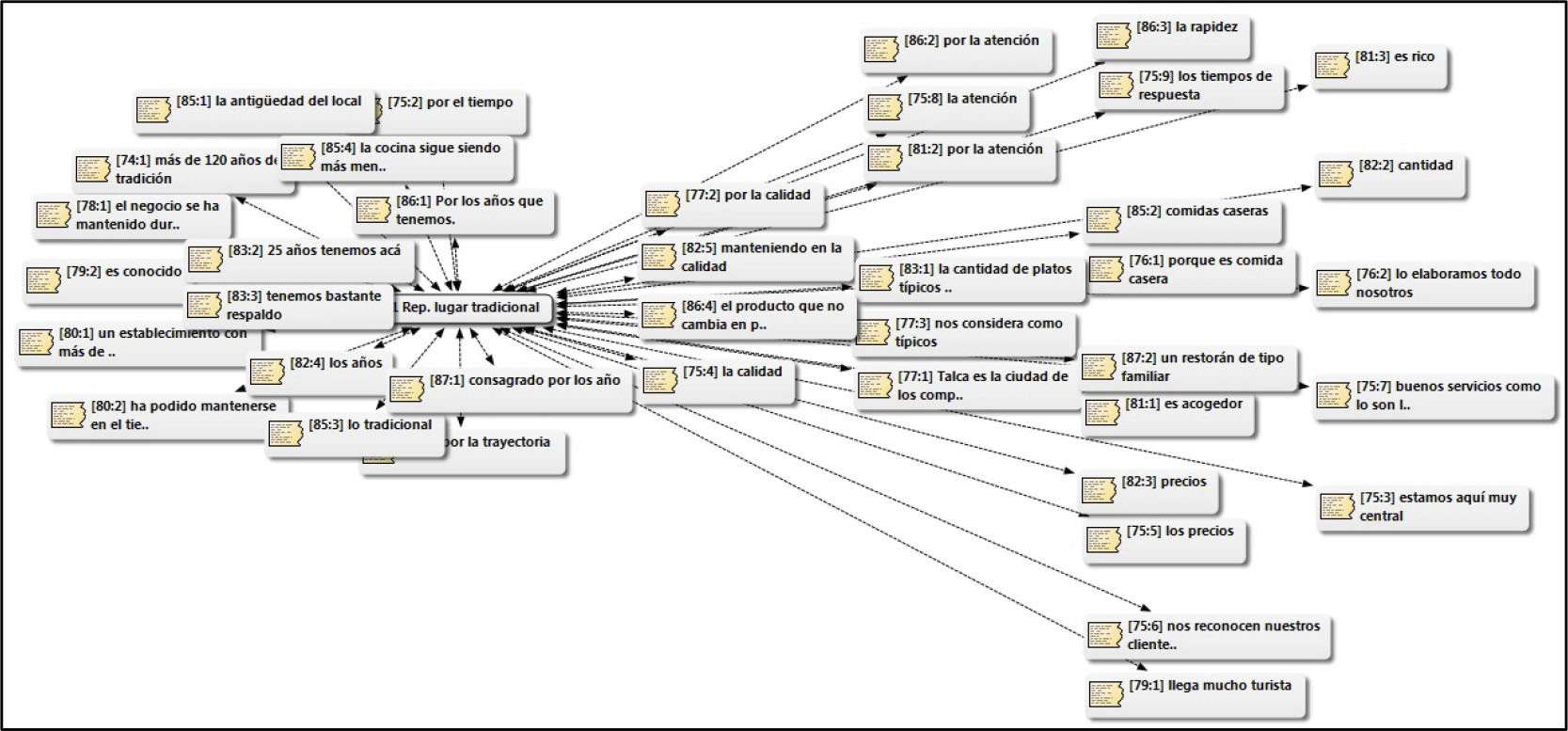 Para los clientes, las características surgen por su calidad gastronómica, con preponderancia hacia su representación de tradicional, para luego emerger el valor por la limpieza, buena atención, precios accesibles y ubicación del recinto. Un cliente de la comuna de Romeral, se refiere de la esta forma a la recomendación: Si me preguntara dónde ir a comer le diría lo más tradicional de Romeral […], preparan bien las cosas, atienden bien y es limpio (C.5).