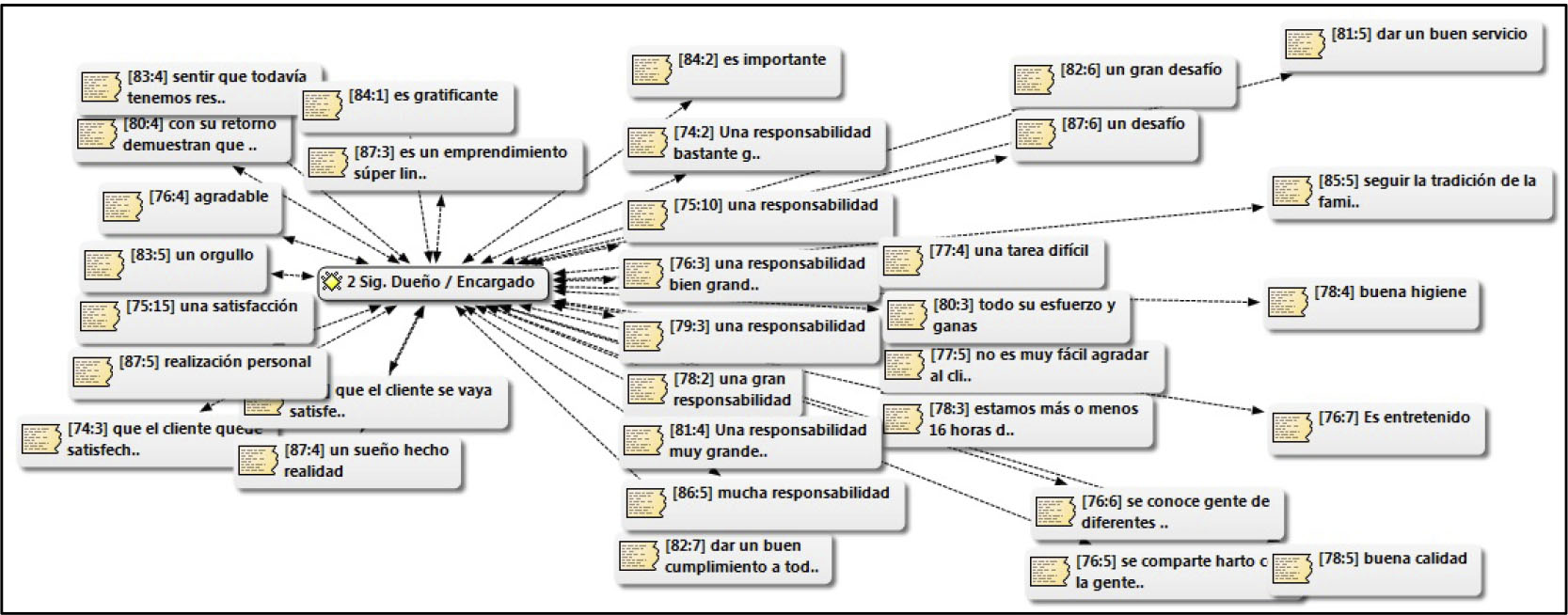 Para el caso de los Dueños/encargados, éstos se representan su posición estructural de gestión administrativa en relación sentimientos de satisfacción y orgullo, connotando el valor del emprendimiento de carácter empresarial. A su vez, se asocia esta condición a la responsabilidad y esfuerzo atribuida a la calidad de dueño y/o encargado del lugar. Ejemplo de lo anterior, podemos refrendar con el siguiente relato de un dueño de restaurante.