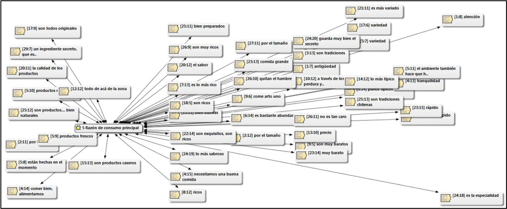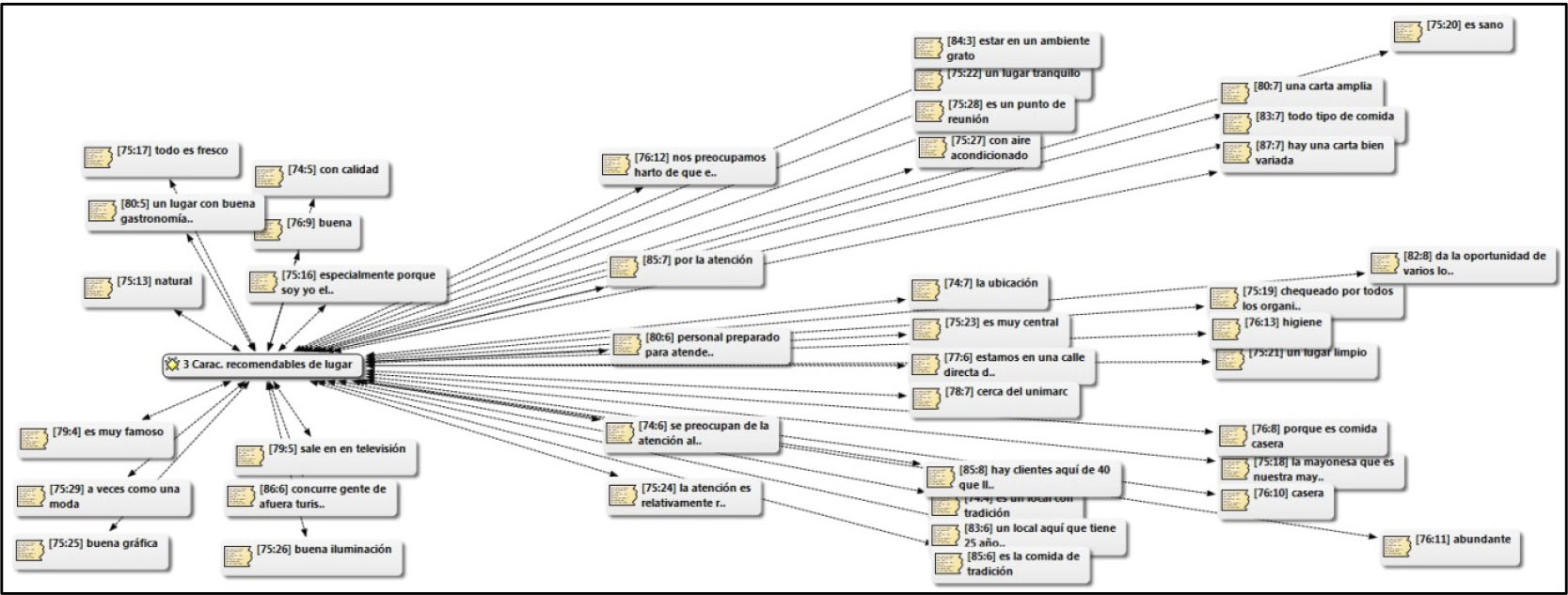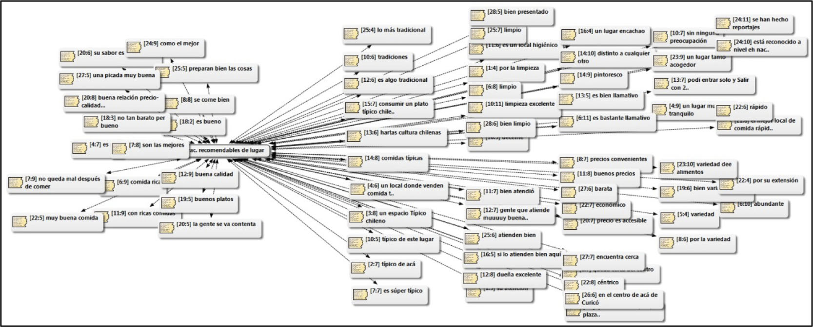 Con el objeto de seguir configurando una caracterización cualitativa del primer objetivo, el cual logre representar a los locales tradicionales, la siguiente categoría se configura desde una situación, cuyo método resulta eficaz para identificar representaciones sociales, las que una vez objetualizadas, se anclan cognitivamente para ser comunicadas desde el lenguaje (Araya, 2002). Usted se encuentra en el centro de la comuna, de pronto un turista le comenta que está de paso por la localidad y este foráneo le pregunta por un lugar típico dónde poder ir a comer ¿Cómo le recomendaría este lugar, considerando que es el local donde Ud. dirige/consume habitualmente? La situación anterior refleja en gran medida las características representacionales que los sujetos poseen y que atribuyen como cualidades que debe tener un local, para ser recomendado.