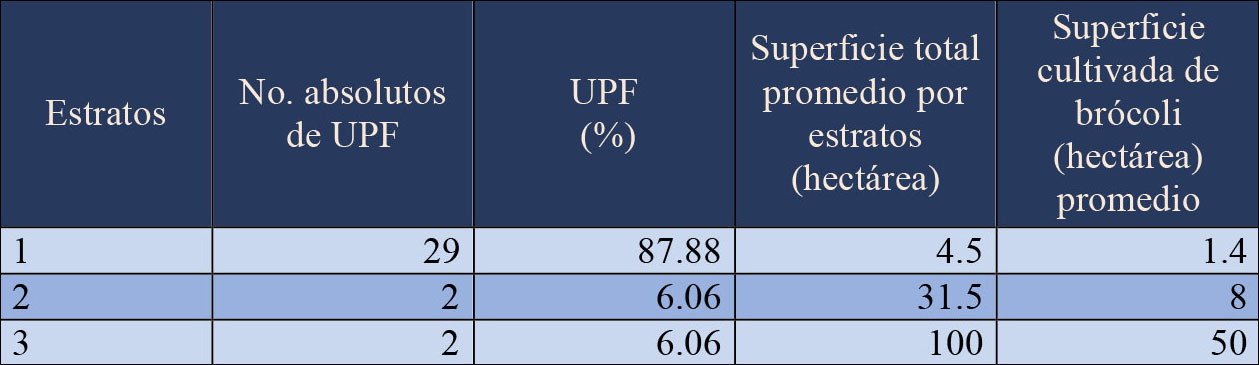 En el cuadro 2 se muestran los tipos de estratos considerados en el campo social del brócoli, en este sentido cobra relevancia la heterogeneidad de las UPF, resaltando el estrato uno con menos extensión de tierra para la producción del brócoli.