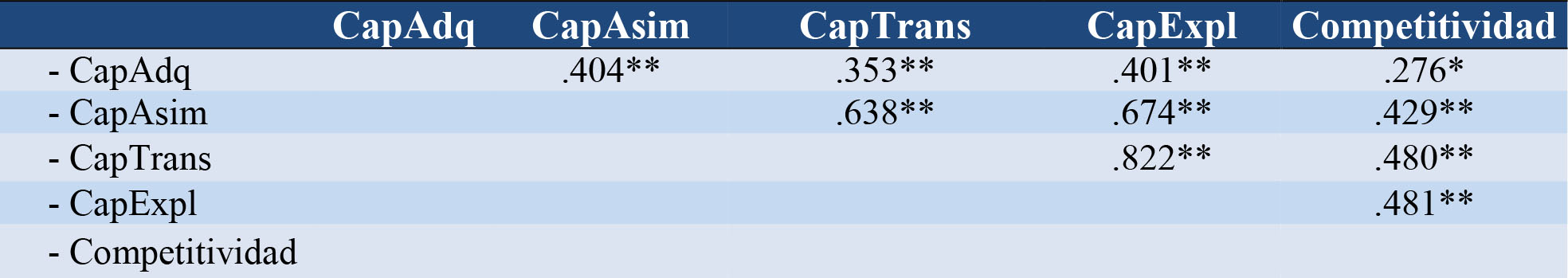 Con el fin de tener una apreciación inicial del grado de relación entre el desempeño competitivo de las empresas y sus distintas aptitudes y habilidades que conforman la CapAb del conocimiento, se realizó un análisis de correlación entre las cinco grandes variables de este estudio: 1. capacidad de adquisición, 2. capacidad de asimilación, 3. capacidad de transformación y 4. capacidad de explotación del conocimiento, por un lado, y 5. la competitividad de las empresas, por el otro.