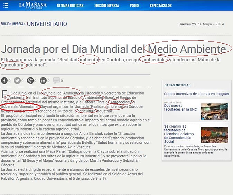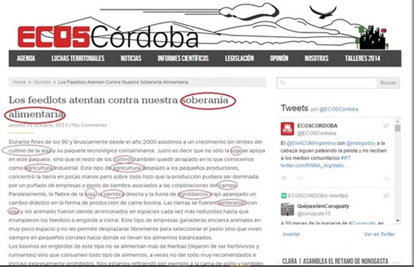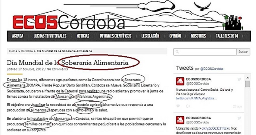 En 2012, ECOS publicó 46 noticias, un número elevado considerando que su primera publicación fue el 04 de septiembre de ese año. A diferencia de LM y LV, en el tratamiento dado a sus noticias, focalizó en Monsanto, destacando las consecuencias socioambientales derivadas de la instalación de la fábrica. En una de estas notas menciona a Sofía Gatica, haciendo una breve descripción de su historia de involucramiento con el juicio a las fumigaciones en Barrio Ituzaingó. Respecto a la cobertura de los hechos, más de la mitad de las noticias muestra una cobertura extensa (74%) y en menor medida mediana (8%) a breve (18%). Se destaca la inclusión noticiosa de otros soportes de información tales como videos o audios cargados en la web y ubicados a un costado de la noticia. La extensión de la cobertura en estos casos se acrecienta en cuanto a su volumen informativo. Con respecto a las secciones, ECOS difiere de los dos diarios anteriores en cuanto al modo en que éstas son conceptualizadas. Así, en contraste con LV y LM donde se destacan las secciones “Ciudadanos” y “Sociedad”, para ECOS (y PRED también) las secciones se diagraman bajo un orden conceptual/ideológico empleando las siguientes etiquetas de sección: “Luchas Territoriales” (26%), “Córdoba” (17%), “Agenda”/“Malvinas Argentinas” (13%), “Informes científicos”/“Noticias” (11%), “Colonia Tirolesa”, “Movilización”, “Legislación” y “Monsanto” (2%). Los temas mencionados fueron “Fumigación” (24%), “Agroquímicos” (21%), “Malvinas Argentinas” (19%), “Ambiental” (14%), “Monsanto” (14%), “Modelo agrario” (8%). Como se aprecia en la Imagen 3 ECOS hace referencia directa al concepto de So. A. informando sobre el Día Mundial de la Soberanía Alimentaria.
