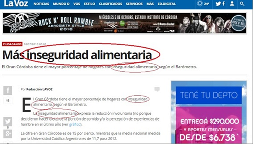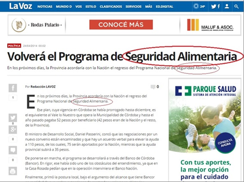 LV publicó 89 noticias este año, menos que el año anterior (120) y menos que LM en el mismo año (131). Solo una noticia hace referencia directa al concepto Se. A., destacando el acuerdo que se pretendía retomar entre la Nación y la Provincia respeto del Programa de Seguridad Alimentaria (Imagen 6). Como indicador más mencionado continuó “Monsanto” (46%) por su instalación conflictiva en “Malvinas Argentinas” (25%); se destaca el cruce de intereses entre la fábrica y ambientalistas. Continúa el acceso a la alimentación como temática prioritaria (16%), reiterándose indicadores como Programa de “Precios Cuidados”, “Ambiente y/o ambiental” (9%) y “pesticida y semilla” (6%). 39% se ubicó en la sección “Política”, luego le siguió “Ciudadanos” (30%) y “Negocios” (11%). El resto se distribuyó en “Opinión” y “Ambiente” (8% y 4% respectivamente). Las secciones con menos cantidad de publicaciones fueron “Consumo” (3%), “Editorial”, “Educación” y “Mundo” (1%).