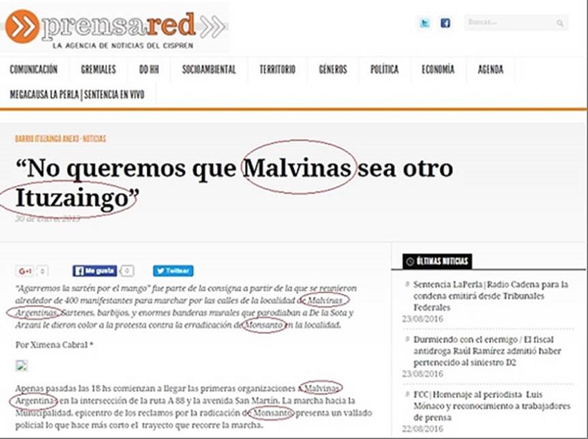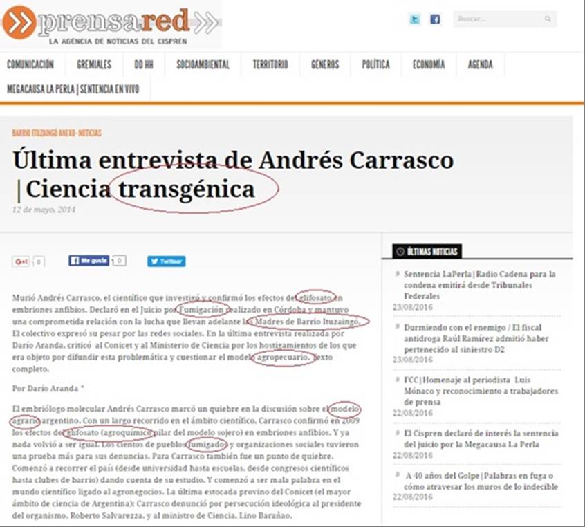 En 2014, por su parte, PRED publicó seis noticias, dos menos que el año anterior. Ninguna hizo alusión directa a So. A y Se. A. Los indicadores más mencionados fueron “Monsanto” (30%), “Malvinas Argentinas” y “Glifosato” (20%). La tendencia se mantuvo respecto de años anteriores: se publicaron noticias que denuncian el problema socio-ambiental que produce Monsanto, destacando opiniones de expertos/as (Imagen 8), exponiendo el conflicto y sus actores principales. Respecto a la cobertura, mantiene la particularidad de los años anteriores: extensas en todas sus publicaciones (100%) y con gran contenido relativo a denuncias. Las mismas se ubicaron prioritariamente en la sección “Barrio Ituzaingó Anexo” (83%) y en menor medida en “Fumigación/Ambiental” (17%).