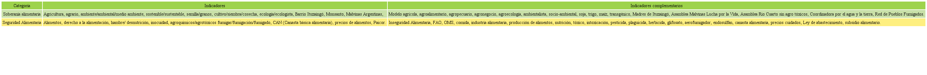 Para la conformación del corpus de la investigación, en la búsqueda de noticias sobre las temáticas de Se. A. y So. A. se incluyeron dimensiones a priori emergidas de la lectura previa de antecedentes junto a dimensiones ad hoc que se advirtieron abiertas u ocultas en el discurso (implícitas). En la Tabla 1 pueden apreciarse, a modo de ejemplo, algunos de los indicadores textuales utilizados. Junto a la consideración de estos indicadores temáticos, se incluyó el estudio de criterios clasificatorios de la información noticiosa tales como fecha de publicación, tipo de artículo, espacio otorgado a la noticia (breve: hasta tres párrafos o menos; medio: de tres a cinco párrafos; extenso: mayor a cinco párrafos) y enmarcamiento mediático (sección), junto a tres variables específicas vinculadas a la tematización periodística de Se. A. y So. A., a saber: actores mencionados, foco editorial (a quién afecta la noticia, dónde sucede, consecuencias relatadas, etc.) y tratamiento discursivo (exhaustividad informativa, postura político-ideológica, relevancia otorgada).