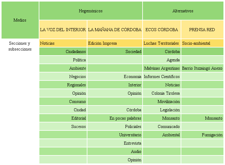 De esta misma manera, se consigió la información de los medios alternativos. Ambos se sostienen en formato web y se encuentran ligados a movimientos y organizaciones sociales. PRED forma parte del Cispren (Círculo Sindical de Prensa), sindicato que reúne una historia de luchas de los trabajadores y trabajadoras de prensa de Córdoba que data de 1953. ECOS, por su parte, es un medio joven cuya primera publicación (04/09/2012) es una entrevista al investigador del Conicet Andrés Carrasco, quien denuncia los efectos de los agroquímicos y la entrada de semillas transgénicas al país.
