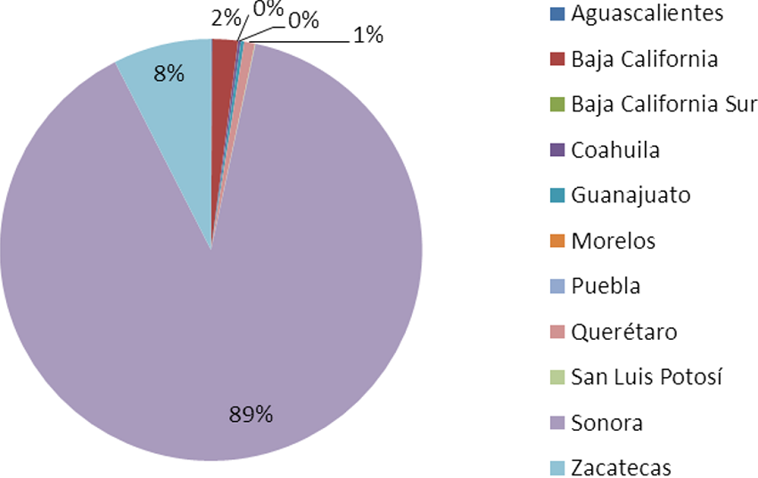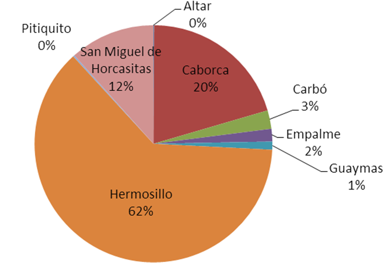 En Sonora, la exportación comercial de la uva inició en 1958, con una venta aproximada de 300 toneladas a una planta vinícola de Baja California (Robles y Taddei, 2004). Hoy en día, la cadena productiva de uva de mesa sonorense (CPUMS) representa una actividad agrícola de relevancia económica para la región, está constituida por alrededor de 34 organizaciones productoras que cultivan una superficie de 19,015 hectáreas, ubicadas, principalmente, en Hermosillo, Caborca y Pesqueira (Gráfica 2), con una producción de 238,478 toneladas. En estas localidades se cultiva el 92% de la uva de mesa nacional y la región de Hermosillo predomina con una superficie de 9,196 hectáreas que concentra el 62% de la producción sonorense (SIAP, 2014).