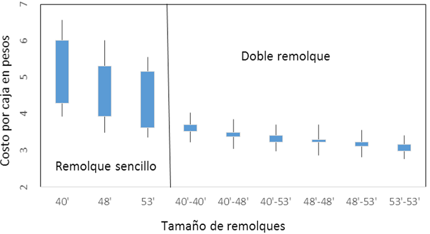 Otra estrategia logística que siguen las organizaciones para hacer eficiente el trasporte, son los métodos de optimización de la carga. Las configuraciones de carga, están condicionadas por la dimensión del remolque y por el dinamismo de mercado. Las organizaciones disponen de tres opciones: la primera con una dimensión de 40 pies de largo, la segunda de 48, y la tercera de 53. Una configuración de carga común es la doble semiremolque de 40 pies de largo y otra, menos frecuente, pero que también se utiliza es aquella que combina la máxima carga, como es la de 53 pies a doble semiremolque, que garantiza un mejor costo por caja trasportada. Si bien, esta configuración de caja está prohibida por la Secretaría de Comunicaciones y Transportes (SCT) ésta es utilizada en periodos donde los precios son atractivos y las empresas buscan enviar más cajas a la frontera. Sin embargo, los gerentes entrevistados manifiestan que la utilización de éstas depende más de la disponibilidad que tenga la compañía transportista subcontratada (Gráfica 3).