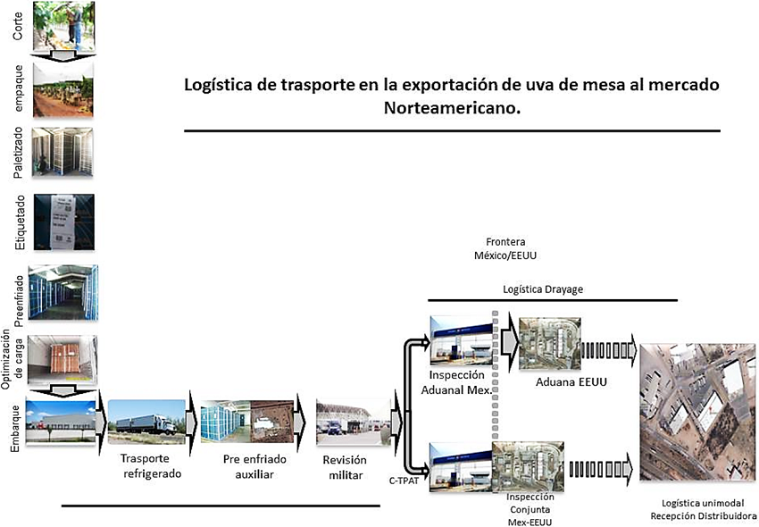 El sistema vid de mesa de mesa en Sonora es un espacio biosocial complejo. Cada parte del sistema es importante y cumple con una función. Sin embargo, existe un eslabón crucial: trasladar en Sonora en época de verano este delicado fruto hacía la frontera estadounidense. El trasporte en particular constituye la columna vertebral de la logística. Aquí reside la responsabilidad de que el producto llegue en condiciones adecuadas. La integración de los procesos de optimización de carga, tiempos, optimización de transporte, constituyen componentes logísticos clave en la logística internacional relativa al transporte, que el sistema vid de mesa implementa para poder cumplir con un mercado dinámico como lo es Estados Unidos.