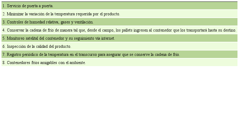 Debido a la necesidad de conservar la cadena de frío y optimizar la vida de anaquel de la uva, es importante considerar algunas características deseables al momento de escoger a un proveedor de transporte (ver Tabla 2).