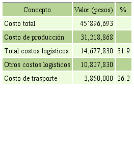 De acuerdo con la información de las entrevistas en las organizaciones exportadoras de uva de mesa, los procesos logísticos representan alrededor del 31.9% de los costos totales de producción, mientras que el transporte representa el 26.2% con respecto al costo total de la logística, porcentaje relativamente superior a lo estimado (Cipoletta, Pérez y Sánchez, 2010), para países no desarrollados quienes encontraron un rango de entre 10 y 15%. Sin embargo, los resultados de este trabajo coinciden con los porcentajes que reporta Ballou (2004), quien estima que los costos logísticos representan de uno a dos tercios del costo total de producción (Tabla 4).