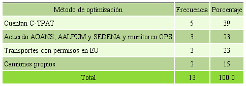 En este sentido, una de las estrategias utilizadas por estas organizaciones es contar con la acreditación C-TPAT que evita largas filas. Las revisiones a la carga tanto por parte del SAT (Servicio de Administración Tributaria) como la U.S. CBP- Customs and Border Protection (2017), se hace de manera simultánea, lo que permite agilizar los tiempos de cruce fronterizo, tal como se mencionó en el punto anterior. Según revelan las entrevistas, la proporción de organizaciones que cuentan con dicha certificación fue del 39% al momento del acopio de datos. Otras argumentaron estar realizando acciones para una futura certificación C-TPAT debido a las exigencias de los distribuidores por hacer eficiente el cruce fronterizo y cumplir con las regulaciones con respecto a: contaminación de la carga, intrusión de sustancias ilegales o no manifestadas (armas, drogas o explosivos) que exige el país de destino. También mencionaron otros métodos para optimizar los tiempos de traslado y entrega de uva a los distribuidores (Tabla 5).