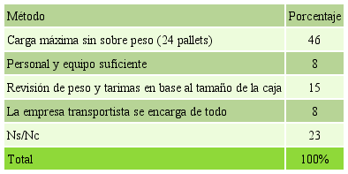 Otros factores que son cruciales en la optimización de la carga tienen que ver la configuración del paletizado (agrupar sobre una superficie paleta o estiba una cierta cantidad de productos, con la finalidad de conformar una unidad de manejo que pueda ser transportada y almacenada con el mínimo esfuerzo y en una sola operación) y los instrumentos técnicos que la soportan como son los montacargas y la verificación del peso por tarima. La mayoría de los entrevistados manifestó poner especial atención a estos tres aspectos para sacar el máximo beneficio de la configuración de la caja de trasporte (Tabla 7).