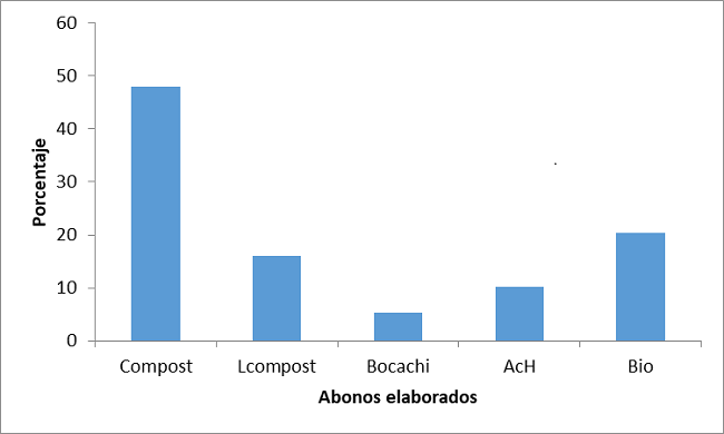 Del 100 % de los encuestados únicamente un 11.5 % prepara algún tipo de abono orgánico mediante el procesamiento de residuos, el mayor porcentaje de abonos elaborados queda representado por el compost y los biofermentos, dichos abonos se preparan con una frecuencia que va de casi siempre a siempre (Gráfica 1).