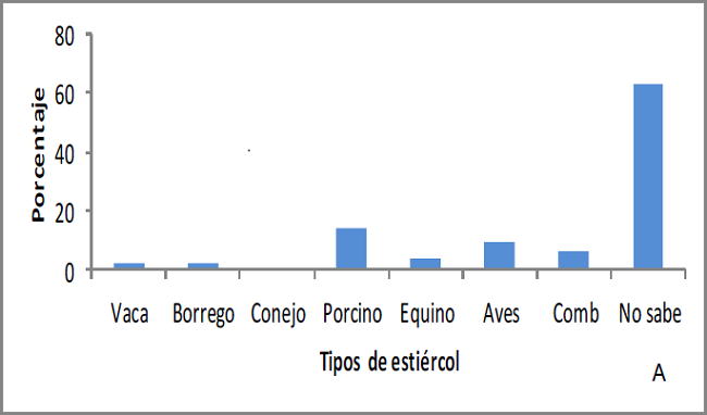 En cuanto a la apreciación que los productores tienen en relación a cuáles son los mejores estiércoles (Gráfica 3A), basados en los efectos positivos que éstos ejercen sobre los cultivos, se encontró que la mayoría de las personas lo desconocen, ya que no han podido apreciar un efecto significativamente diferente entre uno y otro, esto es debido en gran medida a que las deyecciones se almacenan juntas. Aquellas personas que consideran mejor un estiércol que otro establecieron su respuesta primordialmente en lo que han escuchado de otras personas, es por ello que no se aprecia una tendencia clara a preferir un tipo de desecho animal en particular.