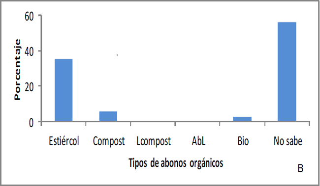 Al preguntar a los productores si sabían qué es un abono orgánico el 100 % contestó afirmativamente y refirió al estiércol como tal; posteriormente, al cuestionarles si sabían qué es o, si al menos, habían escuchado de algún abono orgánico diferente del estiércol (procesado), el 55. 2 % respondió de manera afirmativa y el 44. 8 % dijo no conocer ningún otro.
