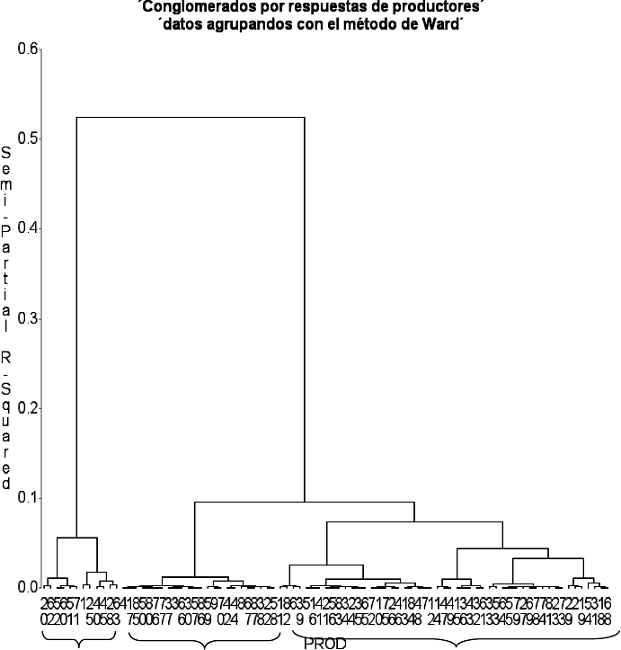Mientras que en el CP3 las variables agrupadas fueron a) total de estiércol (0.35519), b) importancia de la transformación de estiércol en abonos (0.38211) y c) el interés por vender abonos (-0.32951), las cuales aportan un 5.15 % de la varianza. Este componente refleja la relación entre la cantidad de estiércol que se obtiene anualmente por productor con el interés de transformarlo en abono y en su posterior comercialización, como las principales variables. Aquellas personas quienes emplean en campo o traspatio el estiércol generado por sus animales se han podido percatar de los beneficios que éste aporta a los suelos y cultivos y, por ende, tienen una mayor disposición para procesarlo, pero para un posible uso propio o autoconsumo en los traspatios. Al utilizar el método de agrupación de Ward para las respuestas de los productores, se obtuvo el dendrograma siguiente (Figura 1):