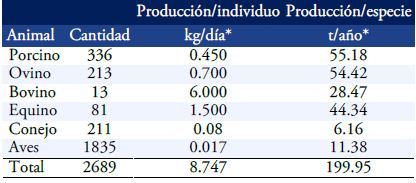 Entre los productores encuestados y con base en cantidades referidas por ellos, el total de estiércol que se obtiene cada año asciende a 87 toneladas, aunque en estimaciones basadas en el promedio de producción de estiércol por especie (base seca), este número puede llegar a casi las 200 toneladas anuales entre el total de animales que poseen los productores que participaron en la encuesta. Los estiércoles de cerdo, ovino, equino y bovino son los que se producen en mayor cantidad (ver Cuadro 1), a diferencia de lo indicado por Turijan (2011) y López et al. (2013) quienes encontraron mayores volúmenes producidos de estiércol bovino en traspatios de diferentes comunidades en el estado de Puebla. La disponibilidad de los estiércoles es buena, además de encontrarse en cantidad, éstos son almacenados tanto en campo como en traspatio, por lo que pueden ser utilizados fácilmente cuando se requieran.
