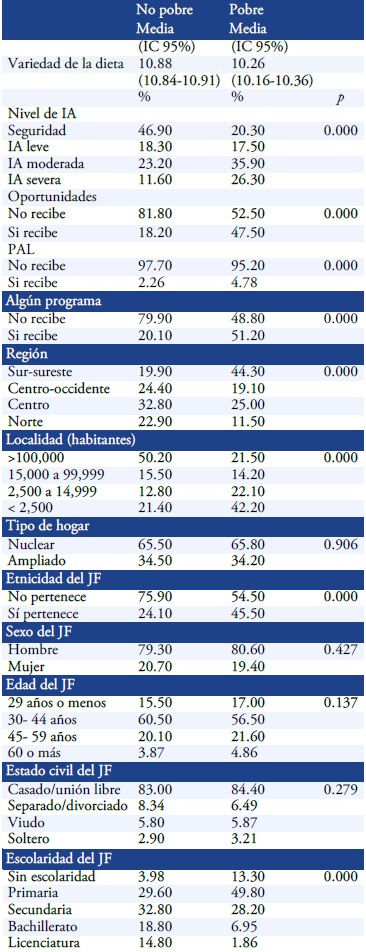Resultados: Los hogares pobres mostraron mayor probabilidad de menor variedad en la dieta y presentar algún grado de IA, así como de recibir algún tipo de ayuda gubernamental. Entre los hogares pobres, el recibir ingresos por programas de asistencia alimentaria no se relacionó con la inseguridad alimentaria, ni con la diversidad de la dieta. En cambio, la inseguridad alimentaria fue más frecuente en los hogares con jefe de familia soltero o indígena. La variedad en la dieta fue menor en hogares de localidades rurales y cuando el jefe de familia tenía baja escolaridad.