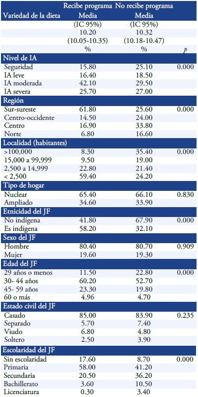 En la Tabla 4 se reporta la asociación de las características sociodemográficas con la diversidad de la dieta. No existieron diferencias respecto a la diversidad de la dieta entre los hogares que participaban en programas gubernamentales y los que no participaban en ellos. Los hogares donde existió menor diversidad fueron los de la región centro-occidente, de las localidades con menos de 2,500 habitantes y entre 15,000 a 99,999 habitantes y en los que el jefe de familia tuvo baja escolaridad.