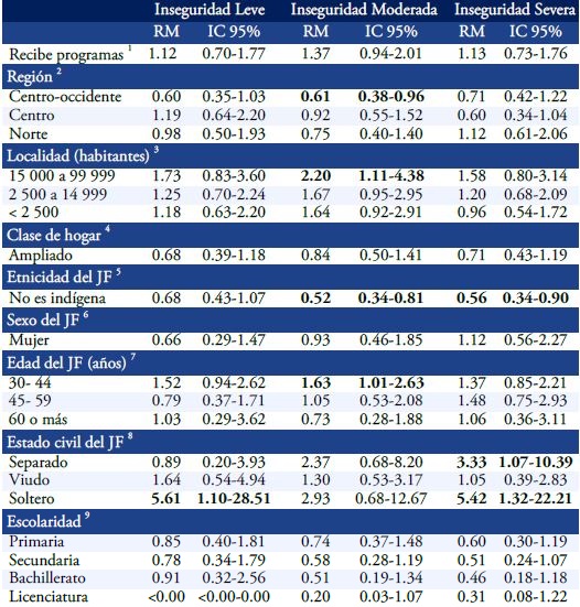 En la Tabla 3 se muestran los factores asociados con la IA en hogares pobres con menores de 18 años. La participación en programas de ayuda alimentaria no se relacionó con la existencia de IA. Los hogares de la región centro-occidente tuvieron menor probabilidad de experimentar IA moderada en comparación con los de la región sur-sureste. La probabilidad de experimentar IA moderada fue mayor en hogares de localidades con 15,000 a 99,000 habitantes que en aquellos de localidades con 100,000 o más habitantes. La probabilidad de presentar IA moderada y severa fue menor en los hogares cuyo jefe de familia no pertenecía a alguna etnia. En comparación con los hogares cuyo jefe de familia era más joven, aquellos donde este integrante tenía entre 30 a 44 años tuvieron mayor probabilidad de presentar IA moderada. Respecto a los hogares encabezados por jefes de familia casados, aquellos cuyo jefe de familia era soltero o separado tuvieron mayor probabilidad de presentar IA leve o moderada.
