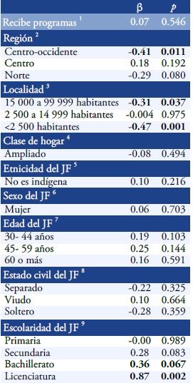 En la Tabla 2 se comparan las características sociodemográficas de los hogares que recibían ingresos por programas gubernamentales respecto a los que no los recibían. En comparación con sus contrapartes, los hogares que recibieron ayuda de algún programa tuvieron mayor probabilidad de presentar IA moderada, de ubicarse en la región sur-sureste o en localidades rurales, y que su jefe de familia perteneciera a una etnia, fuera mayor de treinta años o hubiera cursado hasta la primaria o menos.