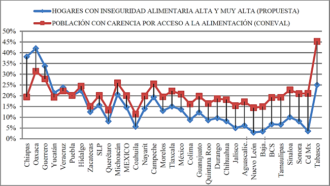 Después de analizar los resultados nacionales, vale la pena distinguir las particularidades de cada entidad federativa y las diferencias con la metodología que aplica Coneval para obtener el indicador de carencia por acceso a la alimentación (Figura 1). Se observa que, en la mayoría de las entidades, Coneval obtiene indicadores más elevados de inseguridad alimentaria, que han llevado a generalizar el problema de carencia por acceso a la alimentación en el país. El caso extremo es el estado de Tabasco, donde al contemplar sólo indicadores de percepción de la población, es decir la metodología de Coneval, cerca de la mitad de la población resulta carente de acceso a la alimentación; en contraste, cuando se incluyen variables de ingreso, gasto y acceso físico, el problema se reduce al 25 % de los hogares.