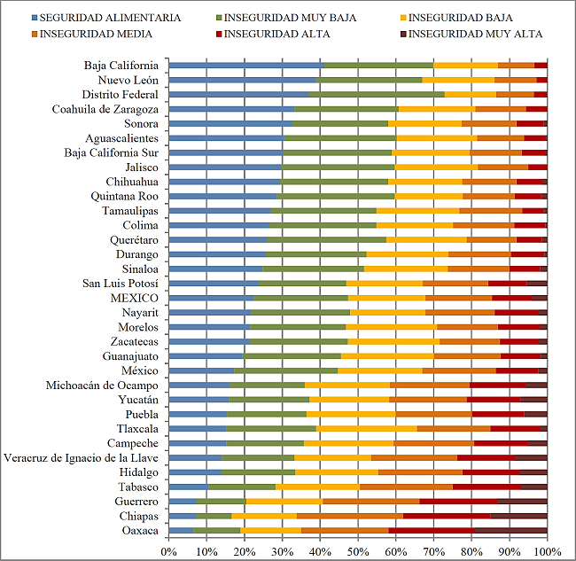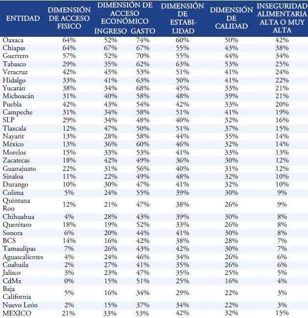 En otras entidades como Jalisco, Ciudad de México, Baja California o Nuevo León; los problemas por acceso físico a los alimentos son mínimos y también hay avances importantes en la dimensión económica. No obstante, persisten niveles elevados de preocupación porque los alimentos no son suficientes o podrían dejar de serlo, porque no son variados y porque no son saludables. En este contexto, es necesario, en principio, reconocer que la inseguridad alimentara o bien la posibilidad de garantizar el derecho a la alimentación en México es un tema complejo. Para esto, se requiere de indicadores que verdaderamente reflejen la heterogeneidad geográfica, económica y social de nuestro país. A partir de un diagnóstico objetivo es posible implementar estrategias acordes a las necesidades prioritarias de la población.