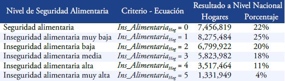 Con base en la suma de los criterios establecidos, los hogares pueden encontrarse en seis niveles de seguridad alimentaria: