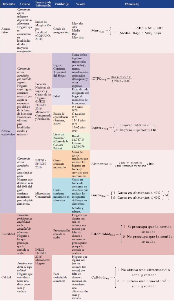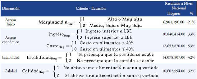 Metodología: Se combinan variables cualitativas y cuantitativas para cubrir cuatro dimensiones (acceso físico, acceso económico, estabilidad y calidad de la alimentación) a partir de cinco criterios (marginación, ingreso, gasto, percepción de cantidad y percepción de variedad).