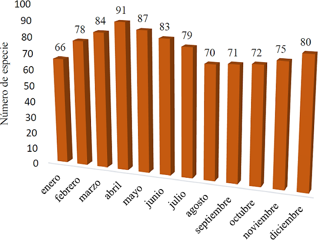 La diversidad vegetal que conforma el arsenal alimentario presente en los 17 mercados municipales del estado de Tabasco estuvo determinada por la presencia mensual de los vegetales en los mercados (Gráfica 1). Se observó que, al inicio del año, se contabilizaron 66 especies en enero y, conforme transcurrieron los meses, se incrementaron 25 especies en el mes de abril para contabilizar un total de 91 especies. Presentó, este mes, el mayor número de especies; a partir de ese momento inició un lento decremento en los tres meses siguientes, hasta el mes de agosto en que disminuyó a 70 especies, aumentando de 71 a 72 y 75 de septiembre a noviembre, respectivamente; finalizó con 80 especies en diciembre. Esto demuestra que la mayor disponibilidad de especies en los mercados municipales se presenta de marzo a septiembre, lo que coincide con la presencia de altas temperaturas y precipitación moderada.
