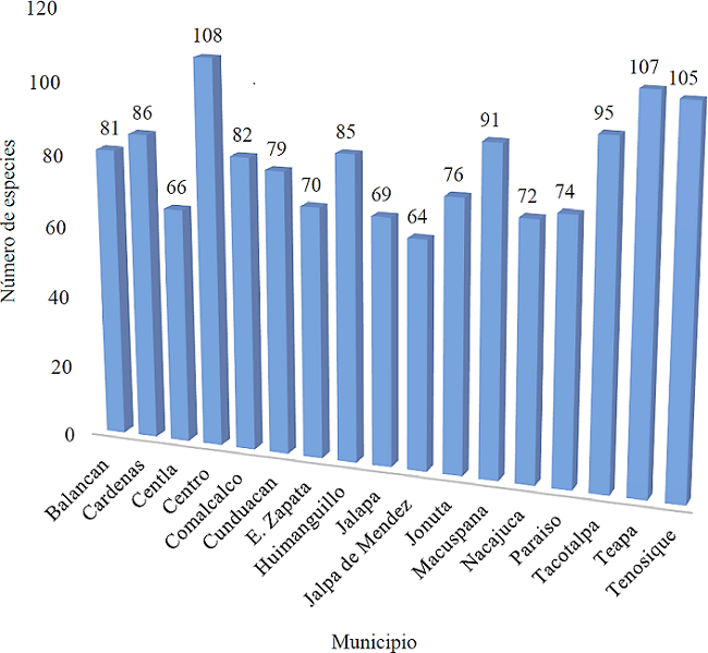 El segundo municipio fue Teapa con 107 especies, lo que puede deberse a su ubicación al sureste del estado de Tabasco y que colinda con el norte del estado de Chiapas. En tercer lugar, estuvo el municipio de Tenosique con 105 especies el cual colinda con el estado de Campeche y con el país de Guatemala. Los municipios en los que se encontraron entre 90 y 100 especies son Macuspana y Tacotalpa que colindan con el estado de Chiapas. Los municipios de Cárdenas, Huimanguillo y Comalcalco presentaron entre 80 y 90 especies. Esta zona se caracteriza por ser la más productiva del estado donde existen plantaciones de cacao, coco, limón y plátano. En este grupo se encontró a Balancán que tiene una diversidad de especies dentro de este rango. Finalmente, los municipios en que se encontraron entre 60 y 79 especies fueron Cunduacán, Jonuta, Paraíso, Nacajuca, Emiliano Zapata, Jalapa, Centla y Jalpa de Méndez siendo este último el de menor diversidad (64 especies) dentro de los mercados del estado.
