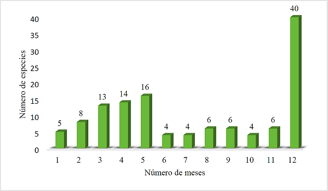 Con respecto a la presencia de las especies comercializadas en los mercados municipales de todo el estado de Tabasco durante el año, se encontró que 40 especies están presentes durante los doce meses y algunas especies presentan una estacionalidad muy marcada encontrándose algunas solo un mes al año (Gráfica 3).